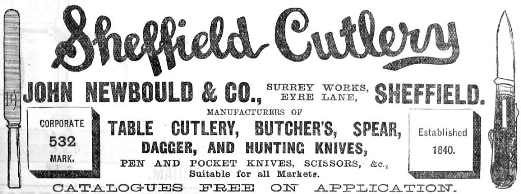 John Newbould was born in Sheffield on 27 July 1812, the son of William, a cutler, and his wife, Frances. He was one of the Newbould Bros. According to an advertisement, John Newbould & Co was established in 1840. It operated from Eyre Street after 1856 and advertised in Birmingham and Sheffield directories as ‘late Newbould Bros’, Eyre Street, selling table cutlery and Bowie, dagger, and spear knives. In 1867, John Newbould, the table knife manufacturer, was bankrupt. However, his fortunes apparently recovered. In 1868, the address of John Newbould & Co was Surrey Works, Eyre Lane, the former address of Standfield, Newbould & Baildon. The directory for that year carried an early advertisement for the firm.