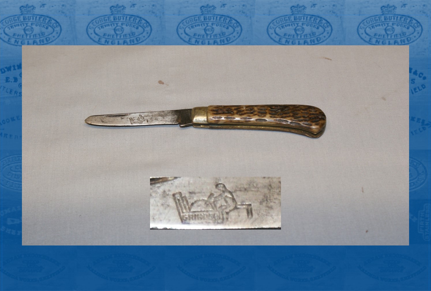 An inter-war trade advertisement showed Robinson’s products. ‘EVERKLEAN’ table cutlery was given prominence, alongside traditional hollow-ground razors, with a range of marks: ‘GRINDER’, ‘DANYL’, ‘KANTOR’, ‘ROBYN’, ‘KANTON’, ‘PHILO’. The grinder (picture) mark had been owned by Green & Green Ltd. The company also produced a traditional variety of pocket cutlery. Herbert Robinson, Rushley Road, Dore, died on 22 December 1935. He was buried at Christ Church, Dore. He left £9,232 to his widow, Gertrude Deniff Robinson. After the Second World War, the firm was styled Herbert Robinson & Co (Cutlers) Ltd at Canton Works, Rockingham Lane. It was bankrupt in 1968.