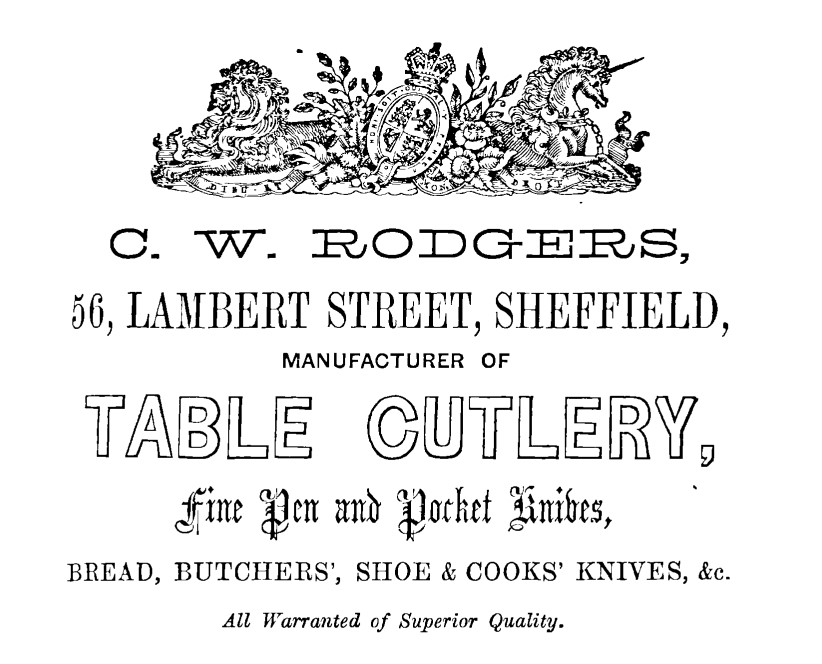 Charles William Rodgers was born in Sheffield in about 1801 and by 1833 was a table knife maker and shop keeper in Westbar. He succeeded to his grandfather’s business in 1836 and by the following year was making table knives – and running a beer house – in Lambert Street. By 1845, when C. W. Rodgers advertised in a Sheffield directory, pen knives had been added to his output. In the Census (1851), he was enumerated in Lambert Street as a 49-year-old cutlery manufacturer, who employed about ten journeymen. He lived with his wife Rhoda née Broughton (born c.1804). An advertisement in the 1852 directory gave prominence to table cutlery. In 1859, Rodgers was also listed as a ‘fancy spring knife manufacturer’ and general merchant – still in Lambert Street, with a residence in Birley Street. C. W. Rodgers died at Birley Street on 23 July 1860, leaving under £1,500. Rhoda continued to trade as R. Rodgers & Son.