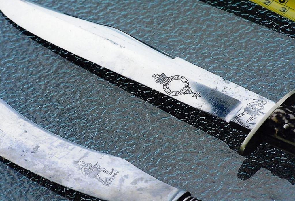 This business was founded in 1850 by James Burnand (1820-1890), who had been born in Sheffield on 1 February 1820, the son of James Burnand, yeoman, and his wife, Isabella. In 1849, he was listed as a fluter and hafter in Rockingham Street. The Census (1851) enumerated him as a plater and hafter, employing two apprentices. In the early 1850s he continued in Rockingham Street and by the end of the decade was involved in the manufacture of Bowie knives. An 1863 directory advertisement has James Burnand & Sons, Netherthorpe Street, as a manufacturer of a ‘silver and plated desserts’ and a wide range of table cutlery (including ‘pic-nic’ or camp cases) and Bowie knives, dagger knives, and ‘lion slayers’. Butchers’ knives and steels, ‘suitable for South America, River Plate, India, and other markets’, were also made. The trade mark was a picture of an Indian brave above the words ‘SELF DEFENCE’. Another mark guaranteed ‘BEST STEEL’ for ‘good cutting quality’; and ‘Q’ within a shield was also registered.