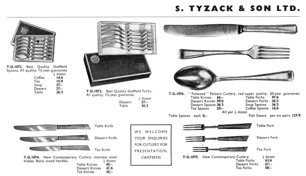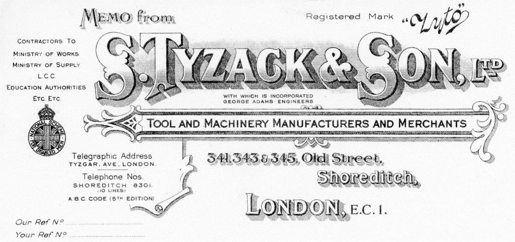 His son, Edgar, inherited the business, which became S. Tyzack & Son in 1905. In 1927, he registered it as a private limited company, with £20,000 capital. Trade catalogues showed a variety of tools and machines for woodworkers and metal workers. Mostly these were factored from Sheffield or Birmingham. Tyzack also marketed a selection of Sheffield cutlery: scissors, pen knives, carving sets, table knives, spoons, forks, and canteens. S. Tyzack & Son was managed successfully by Edgar until his retirement. He died at Bournemouth on 8 November 1959. He left £110,496 and a widow, Bertie May Tyzack. The firm continued in family hands until it and its subsidiaries (Parrys and Ross & Alexander) were wound up in 1989. The trade mark ‘ZYTO’ was sometimes used on Tyzack’s products.