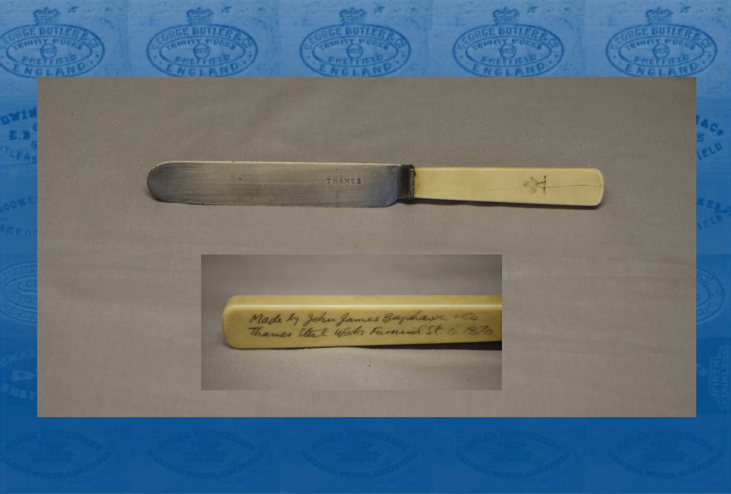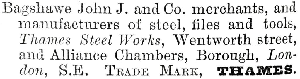 The Hawley Collection has a table knife marked: ‘THAMES’, on the handle of which an anonymous scribe has added: ‘Made by John James Bagshawe & Co, Thames Steel Works, Furnival Street’. John J. Bagshaw (1835-1875) was born in Sheffield, the son of Samuel (a linen draper at Westbar) and his wife, Maria. John became a book agent and then a commercial traveller, probably in the metal trades. In 1861, he described himself in the Census as a steel merchant. In about 1865 (the year he became a member of the Institution of Mechanical Engineers), he launched Thames Steel Works at Wentworth Street. In 1868, he posted an advertisement in the local directory, which mentioned an office in London. His trade mark was ‘THAMES’. Within a year or so, he had moved his manufactory to Arundel Street. It was apparently located near the intersection with Furnival Street and extended down the hill to Arundel Lane. Bagshawe’s was listed as a merchant and manufacturer of steel, files, and tools. Bagshawe acquired a partner: James C. Clark. It is not known whether Thames Steel Works melted steel, but certainly it would have relied upon factoring and outworkers. Bagshawe claimed in 1871 that he employed 130 workpeople.