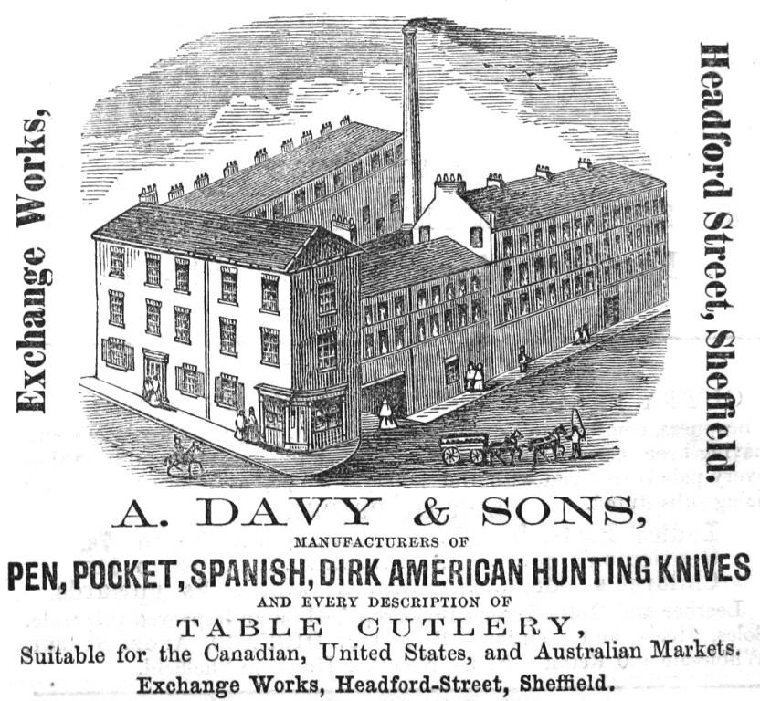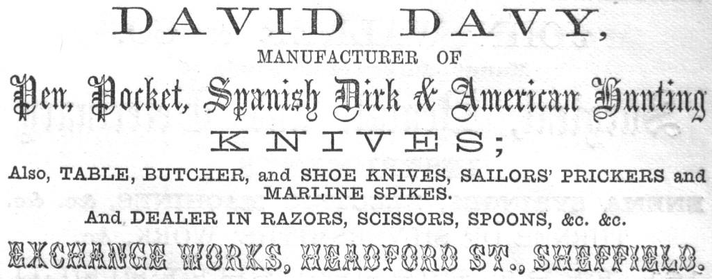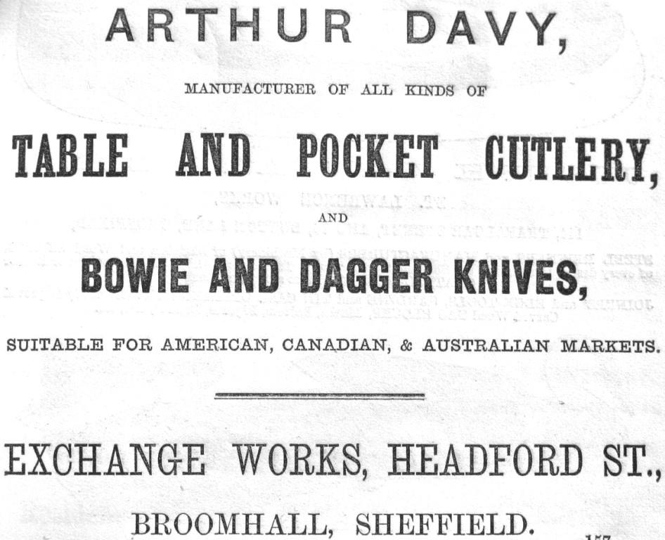 In the early 1860s, Abraham was partnered by his son David and George Bagshaw, who manufactured crucible steel (David had married Bagshaw’s daughter in 1862). In 1866, this partnership was bankrupt (though the bankruptcy was discharged in the following year). The American Civil War had presumably hit business and by 1871 Abraham employed only four men (according to the Census). Abraham continued in the cutlery trade, but during the late 1860s and 1870s the trading names at Exchange Works were ARTHUR DAVY and DAVID DAVY. In 1868, Arthur and David advertised separately from that address. In the directory (1876), David Davy appeared in a list of Bowie knife makers.