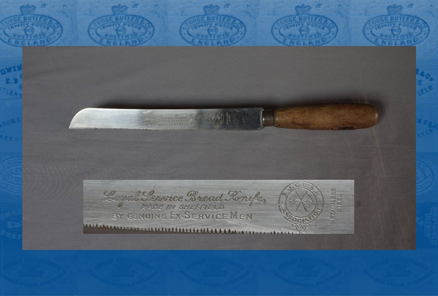 The knives in our collection were probably manufactured by a Sheffield cutlery company employing ex-service men who had been injured or disabled during the first world war. A number of Sheffield cutlers were involved but no record of their names remain and hence we cannot identify where this knife was made. A Sheffield company making the cutlery was reported to have an arrangement with the Association to use the inscription 'Loyal Service, Made in Sheffield by genuine ex-servicemen' and 'Loyal Service'.