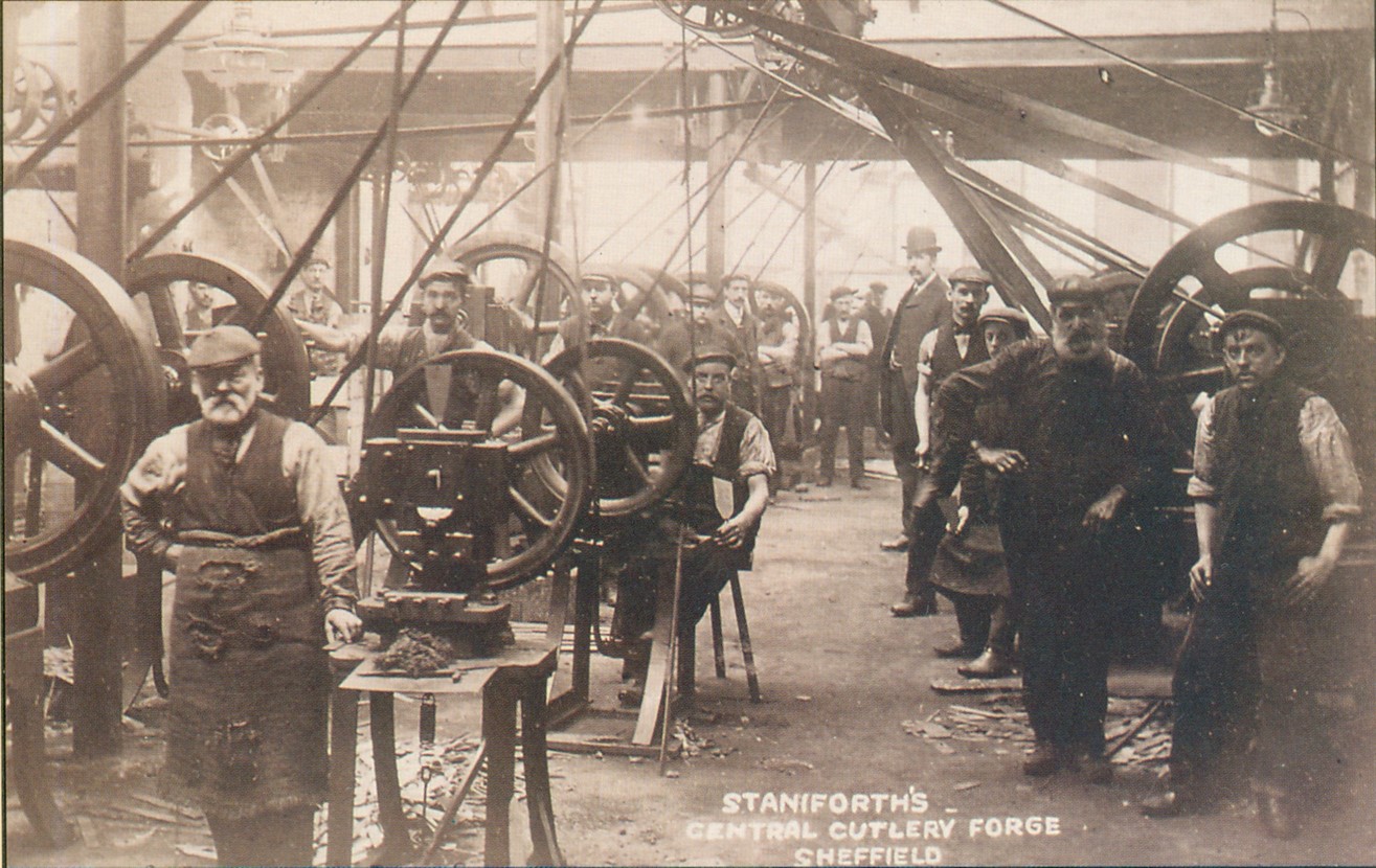 Samuel Staniforth was apparently born in Sheffield in 1840. He may have been the son of Samuel, a pen blade forger in the Park, and his wife, Prudence. Samuel Jun. began business in 1864 at a cutlery forge in Carver Street He manufactured materials for Sheffield cutlers: forged blades, springs, and scales for pen and pocket knives. He was bankrupt in 1867, but was discharged in the following year. He eventually occupied Central Cutlery Forge at 49-51 Carver Street, where in 1880 he installed steam-powered machinery for forging table-knife and butchers’ blades from steel sheet (a process that made hand-forging redundant). In 1881, Staniforth’s workforce was 20 men and eight boys. A photograph of his Forge (c.1900) showed rows of machines – presumably for stamping blade blanks – driven by belts from an overhead central line-shaft. Staniforth at various times also had workshops and forges in Backfields; at Spooner (Rivelin Bridge) Wheel; and Union Wheel in Alma Street – suggesting that he had not entirely abandoned hand-forging. He once described his speciality as ‘double shear blades and fancy shape carvers, shell blades and forks of every description’.