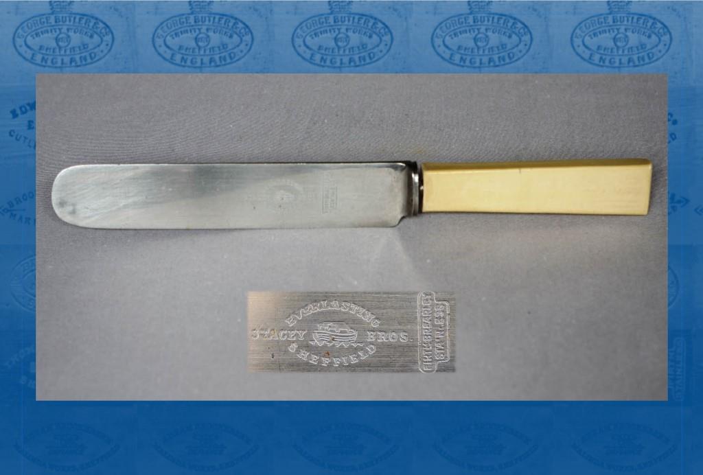 In 1913, Stacey Bros was acquired by Alfred Field & Co (Sheffield) Ltd, when the partners – Francis Wright and John Warren Hubbard – joined Field’s. Field’s used Ark Works for its offices, but Stacey Bros continued to operate as a stand-alone name. In 1919, its address was Ark Works, Trafalgar Street (the same as Field’s): but Stacey Bros had its own marks. Besides ‘THE ARK’, it used ‘SUPERB’ and ‘CUTWELL’ of John Coe & Co, ‘EVERLASTING’ of Thomas Turner, and the name of Thomas W. Ward & Co. The Hawley Collection has a stainless knife, which was probably made at the start of the 1920s, and had both ‘Ark’ and ‘Everlasting’ etchings. Thereafter, the history of Stacey Bros becomes more obscure. By 1925, its address was Clough Road, but by the end of the 1930s (after Field’s had closed) it was at Bramall Lane. Presumably, Francis Wright retained ownership of Stacey Bros. He died on 9 March 1939, leaving £3,710. Stacey Bros disappeared, though its trade marks were eventually owned by A. H. Bisby.