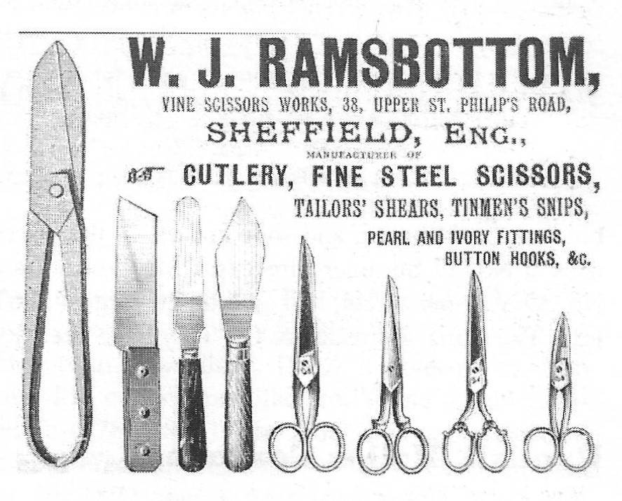 In about 1878, Walter Jeffcock Ramsbottom (b.1849), the son of a brass turner, launched W. J. Ramsbottom (as ‘successor’ to Thomas & Joseph Colley) at Vine Scissors Works, 38 Upper St Philip’s Road. In 1881, his workforce of 26 men produced fine steel scissors, tailors’ shears, butchers’, putty, and palette knives. The company advertised in 1887. Ramsbottom was still involved in scissors manufacture in 1901, when he lived in Western Bank. His trade mark was a spinning wheel and the words ‘I SERVE’. The business adopted limited liability in about 1909. The ownership of the business becomes confusing at this point. W. J. Ramsbottom himself was no longer listed in Sheffield directories. By the 1920s, he had moved to London. He died at The Mall, Southgate, on 21 July 1927, leaving £4,418.