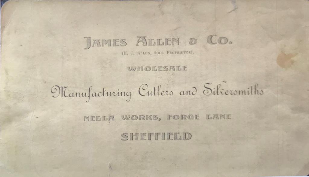 In about 1906, Harry James Allen launched James Allen & Co as a cutlery manufacturer at 92 Arundel Street. In 1910, he was again brought before local magistrates. This was to answer charges that he had applied a false description to ‘through-tang knives’ (in which the tang passed the length of the table knife handle and was secured at the end by a riveted head). Allen’s cheaper version had only a small tack at the end and a short tang. A. J. Hobson – whose firm manufactured and advertised the original article (Thomas Turner & Co,) – gave evidence. Allen was fined 40s (£2) and forced to withdraw the knives (Sheffield Daily Telegraph, 29 June 1910).