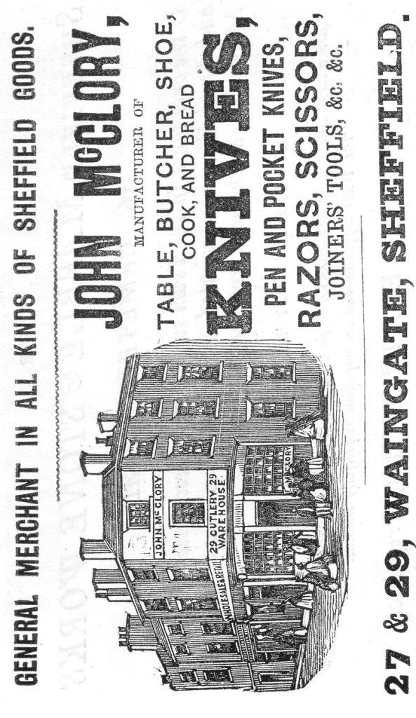 John McClory (1821-1867) was born into an Irish Catholic family in County Down. He worked with fellow-Irishman, Thomas McGivern, until about 1861, when he opened his own cutlery ‘warehouse’ in Waingate (advertised in Pawson & Brailsford’s Illustrated Guide, 1862). John McClory died after ‘a short but severe illness’ on 7 November 1867, leaving under £2,000. By the early 1880s, his sons, John (1853-1913) and William Vincent (1854-1913?), were trading as John McClory & Sons, Eldon Works, Eldon Street, table and pocket cutlery manufacturers and general merchants. According to a vanity publication: