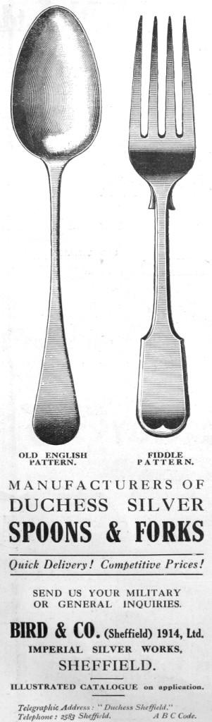 In 1914, Bird & Co (Sheffield) 1914 was registered with £2,000 capital, after Ryalls, Turner & Co bought Bird’s firm for £2,400 cash. Debentures of £2,500 were then issued. Also acquired was Bird’s bagpipes trade mark. Edward Bird died in Bombay on 21 November 1916, leaving £2,200. The name ‘Practical Cutlery Co’ was briefly resurrected in 1919 as an edge tool manufacturer in Broad Lane. ‘DUCHESS’ was used by Mottershaw & Rowe; the bagpipes mark later passed to George Wood.