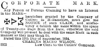 William Bradshaw Sen. died at his residence at Western Bank on 1 February 1844, aged 64. His wife, Mary, had predeceased him on 9 July 1837, aged 62, ‘after a lingering and painful illness’ (Sheffield Independent, 15 July 1837). They were buried at the parish church (St Peter & St Paul). William Jun. continued to trade at Orchard Street. His residence was at Broomspring Lane, where he lived with his wife, Elizabeth nee Crossland (whom he had married in 1840). In the late 1870s, Bradshaw retired, and he died at his home on 2 February 1883, aged 77. He left an estate of £905 to Elizabeth (who died in 1884, aged 72). Their grave is at City Road Cemetery. Maleham & Yeomans acquired the Bradshaw mark: a Maltese Cross and the letters V and M (placed horizontally), which had been granted in 1780.