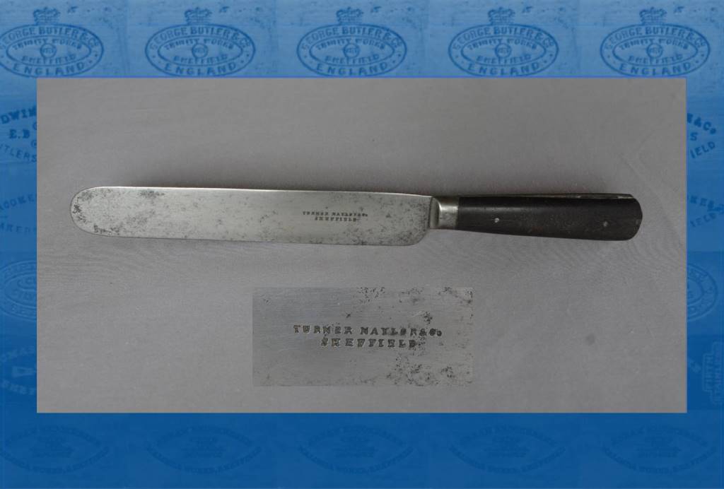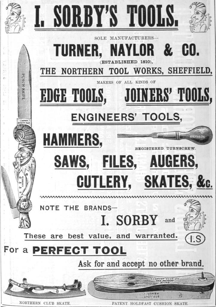 Advertisements show a start date of 1810. The partners were John Sorby (1780-1829) – who was related to the Sorbys of Attercliffe – John Turner (bapt.1778-1857) from Eckington, and Henry Skidmore (c.1766-1822). They made edge tools, cutlasses, and machetes in the Wicker. After 1822, the firm became Sorby & Turner. John Sorby died on 4 December 1829, aged 49, and was buried in Attercliffe (Sheffield Independent, 5 December 1829; 22 May 1830). By the 1850s, Turner’s son Charles (1813-1885) and Joseph Turner (1810-1895) – apparently his nephew or son – were in Earl Street. In the directory (1856), they advertised the mark ‘I. SORBY’. Charles withdrew in 1858 and Joseph Turner & Co began in Castle Hill. In 1859, Joseph Turner registered the ‘PUNCH’ mark. Joseph Naylor (1833-1928) and Thomas Goodwin became partners. The latter left in 1868. By 1871, Turner, Naylor & Co had been formed at Northern Tool Works, John Street, with 87 workers. Charles Marples (1848-1901), from Wm. Marples & Sons, joined the firm.
