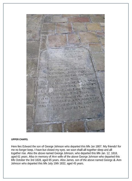 In 1823, the Furnival Street premises (‘workshops, warehouses, and other buildings and conveniences in yard adjoining’) were auctioned by Ann (Sheffield Independent, 15 November 1823). These had housed George Johnson & Son and its successor George Johnson & Co. Ann and George dissolved their partnership. Ann Johnson & Sons was next listed in Furnival Street as a manufacturer of table knives and surgeon’s instruments. Ann died on 3 October 1828, aged 65, ‘after a long and protracted illness’ (Sheffield Independent, 4 October 1828). Her burial was also at Upper Chapel.
