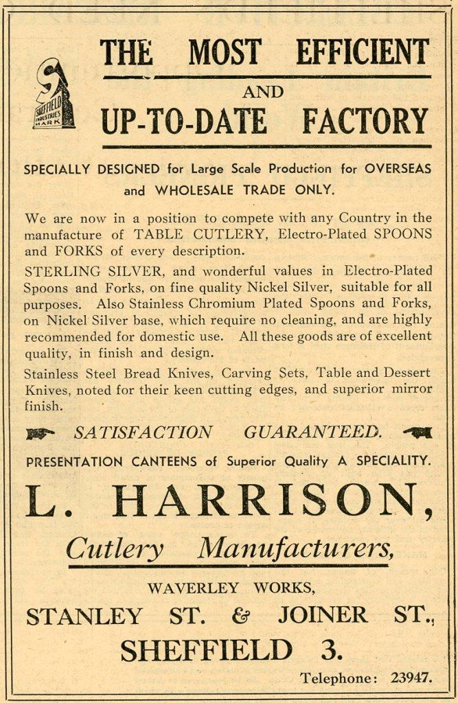 He left £446 to Hilda. She continued ‘L. Harrison’ in Solly Street with Jacob Brown, but this was dissolved in 1921. Hilda continued the ‘Louis Harrison’ business alone and by the mid-1920s she had relocated it to Stanley Street in the Wicker. In 1930, Hilda registered the trade mark ‘TRUSTY’. She succeeded in expanding the business, even during the difficult years of the Depression. She exploited the demand for stainless table cutlery, and electro-plated and chromium-plated spoons and forks. Presentation canteens of cutlery were a speciality. She advertised Waverley Works at Stanley Street and Joiner Street as ‘The Most Efficient and Up-To-Date Factory’, with the output ‘specially designed for large-scale production for overseas and wholesale trade only’.