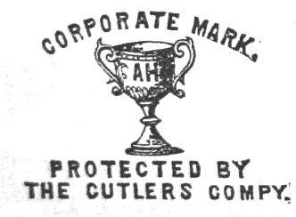 Aaron Harrop was born in Sheffield in 1848, the son of George and Mary Harrop. His father was a labourer, though Aaron was trained as a table knife cutler. In 1879, thirty-one year-old Aaron Harrop was listed as a table knife and fork manufacturer in Rockingham Street. He had a staff of one man and two boys. By 1883, the firm was Aaron Harrop & Sons, located at Sheffield Ivory Works in Rockingham Street. In 1886, the firm displayed at the South Yorkshire Trades Exhibiton bread knives, which had been carved out of the old oaken pews of the parish church. In 1887, an advertisement for the company at Carlisle Works, Rockingham Street, offered a wide range of cutlery from table cutlery, bread, butchers’, and spring knives. The trade mark was a presentation cup (picture) on which was the letters ‘AH’. However, in 1887 the stock, goodwill, and trade mark of the company were offered for sale. In the 1890s, George Edward Harrop (one of Aaron’s sons) started his own business. However, by 1905 the name Aaron Harrop & Sons had reappeared in directories at Rodgers’ Wheel, Norfolk Street. It was listed until about 1921. Aaron Harrop, Upper Hanover Street, died on 25 February 1919, aged 70. He left £228.