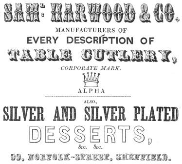 In the early 1840s, Samuel retired in favour of George S. P. Greening, Thomas Nicholas Greening, and Charles Goodwin. In 1849, Burdekins & Greening (late S. Harwood & Co) was listed as a merchant and cutlery manufacturer at Norfolk Street and Norfolk Lane. This partnership (Thomas Pierson Burdekin, Joseph Burdekin, and Thomas N. Greening) was dissolved in 1850. The ‘ALPHA’ mark was acquired by Harrison Bros & Howson.