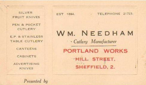 William Needham (1853-1915), a maker of silver fruit-knives, was born in Sheffield, the son of Joseph Needham, a maker of joiner’s tools. As a teenager, he trained as a ‘silver cutler’ and by 1881 was working in Jessop Street. A trade card dated his firm from 1884; and he registered a silver mark from Jessop Street in 1891. Later his works address was Jepson’s Wheel, Jessop Street; and he lived at Harefield Road. By 1911, his business was in Eyre Street. Needham’s kn....