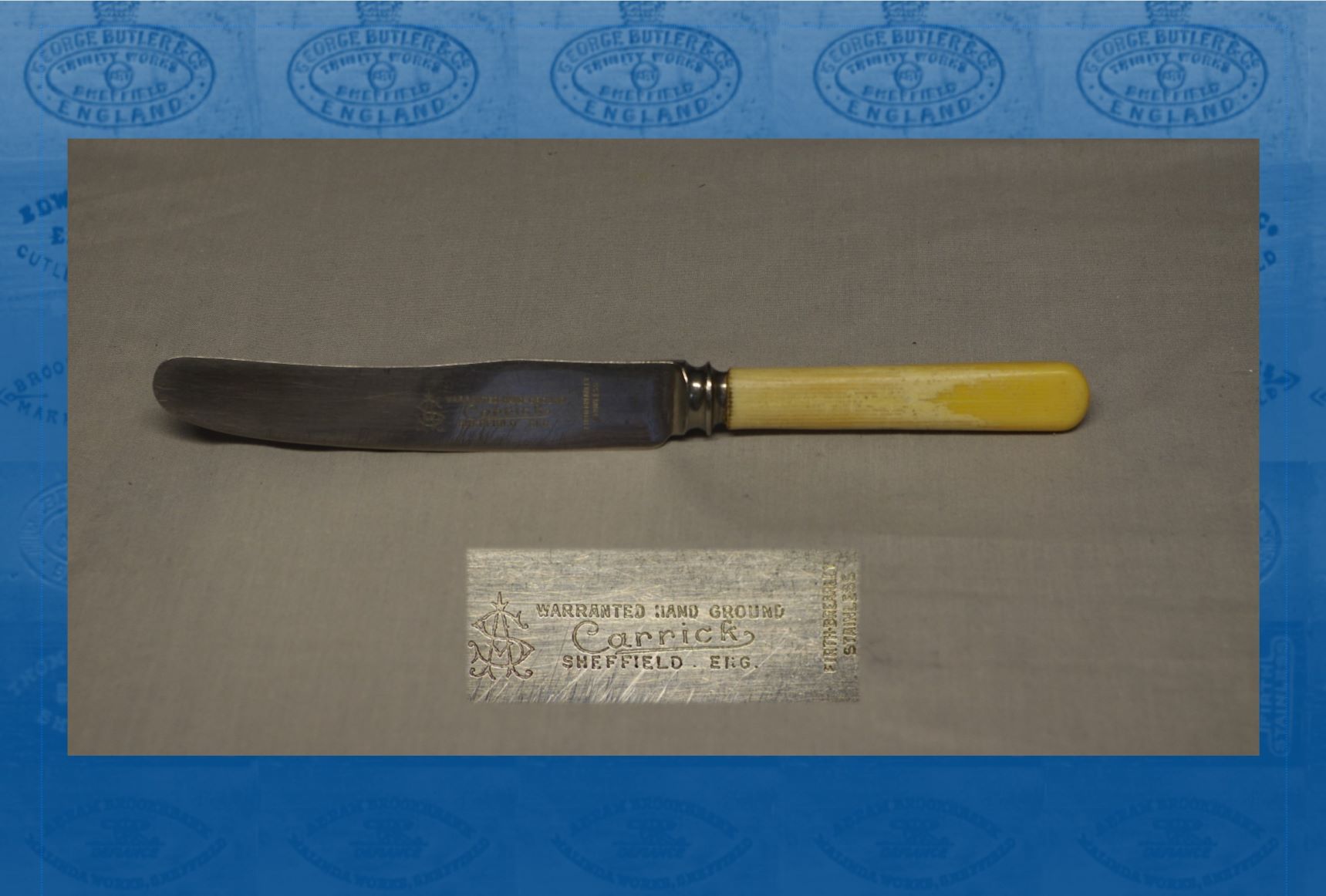 The knife we have in the Collection is marked ‘Firth Brearley Stainless, Sheffield’, with the single name ‘Carrick’, however there does not appear to have been a firm by this name that traded in Sheffield. It was common practise to purchase knives etched ‘made in Sheffield’ and add the name of the Company retailing them.Carrick Bros, 237 Argyle Street, definitely sold ‘Gent’s knives’ and open razors with ‘made in Sheffield’ etched on them. It....