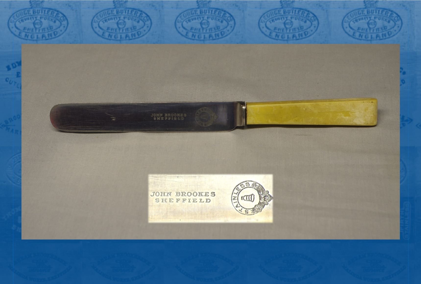 It is difficult to identify the maker of this table knife, as no John Brookes has been found in twentieth-century Sheffield directories. The etched trade mark of a bell, though, is intriguing. It was the well-known mark of Brookes & Crookes. The ‘Brookes’ in that firm was John Brookes (though he had been dead since 1865). Perhaps Brookes & Crookes resurrected the name (though it is difficult to offer a reason why they would do so); or maybe someone else was trying to pass off....