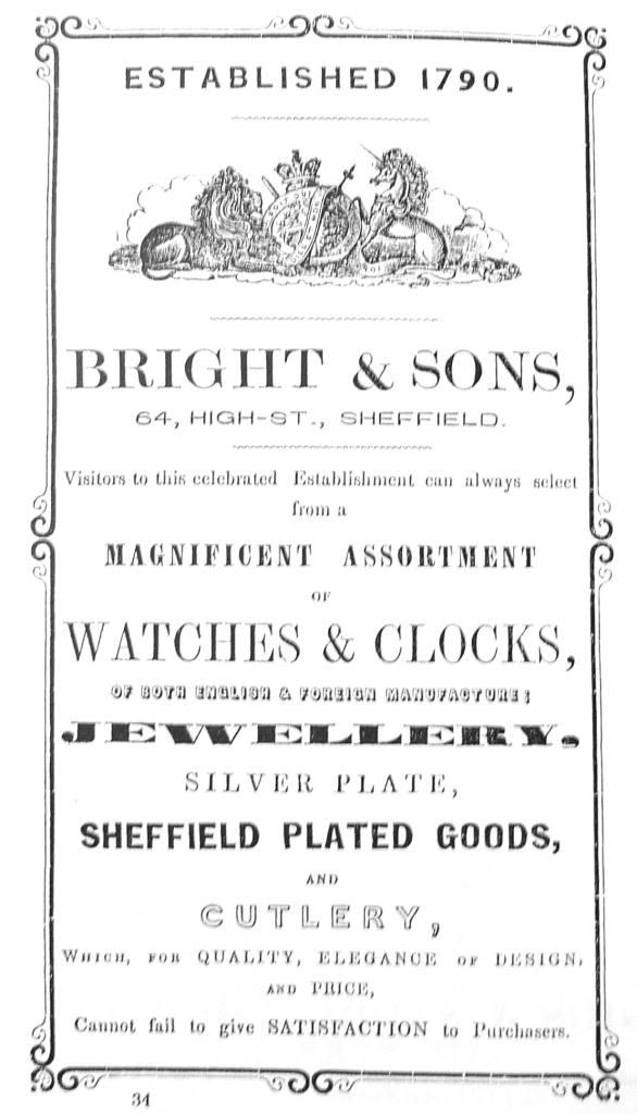 A trade advertisement dated the Bright’s business ventures from 1766. About twenty years later, Isaac Bright (1763-1849) – born ‘in foreign parts’ – and his younger brother Philip Bright (1784-1841) arrived in Sheffield and became jewellers and silversmiths (Lipson, 19471). They were reputedly the first Jewish family to make a mark in the town after opening a shop in Market Place (leading to High Street). One advertisement has an establishment date of 1790. The Sheffield Iris, 26 January 1813, a....