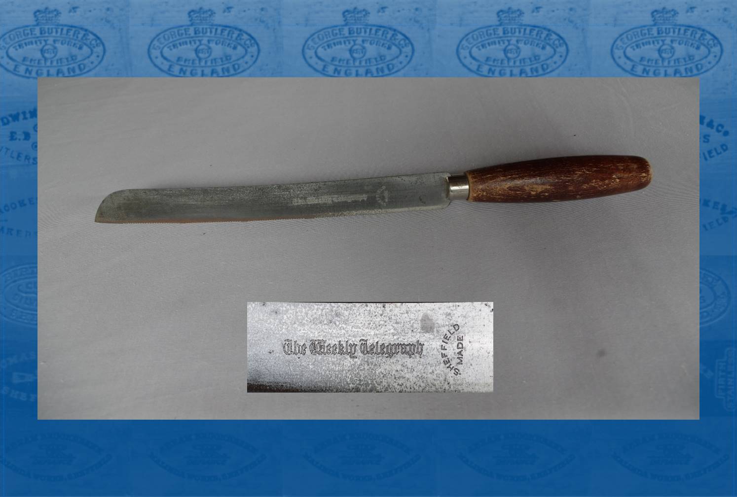 We believe this knife was made in Sheffield, possibly for the local newspaper called The Weekly Telegraph which was published between 1884 and 1951 (It was known as The Sheffield Weekly Telegraph between 1884 and 1887). The newspaper regularly ran competitions for its readers and, as well as cash prizes, offered many consolation prizes including bread knives. See the list of consolation prizes from a competition in 1900.It is also possible that the knife was made for another newspaper with the same name - the script on the b....