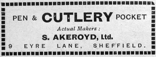 Samuel Akeroyd (1866-1932) was born at Leeds, but by 1911 was living in Sheffield and working as a pattern maker. In 1919, he registered S. Akeroyd Ltd as a cutlery manufacturer. The subscribers (apart from Akeroyd) were A. H. Bedford, an engineer; and J. Jepson, a coal merchant. Capital was £2,000; the registered office was at 184 Broad Lane. However, an advertisement in 1920 for Akeroyd’s pen and pocket cutlery had the address as 9 Eyre Lane. In that year, the firm file....