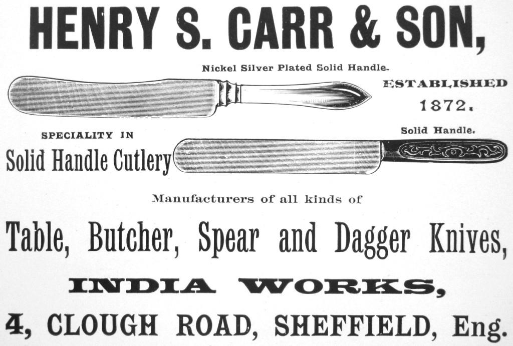 This table-knife manufacturer was founded in 1872 by Henry Steel Carr (c.1831-1912). He had been born in Kirk Smeaton, Yorkshire, but was living in Sheffield by 1861, where he became a grinder. In the Census (1881), he was a ‘jobbing grinder’. By 1893, his firm was located at Brunswick Works, Eldon Street. In the early 1900s, George Taylor Carr (1858-1909), the founder’s eldest son (who had been born in Doncaster), had become partner. The latter was involved in perfecting the u....