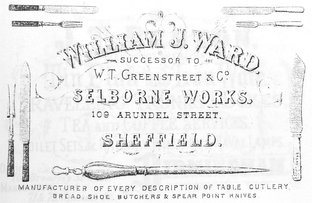 William Joseph Ward (1843-1923) was born in Sheffield, the son of William (a grinder) and Jane Ward. In 1861, his father was a grocer in Hillfoot (and also a table knife grinder); his son was a merchant’s apprentice. He became a table knife manager and later (probably in 1876) the ‘successor’ of W. T. Greenstreet. In 1879, he was based in Carver Street as a table cutlery manufacturer; and according to the Census (1881) employed seven males and three females. He advertised in 1884 fro....