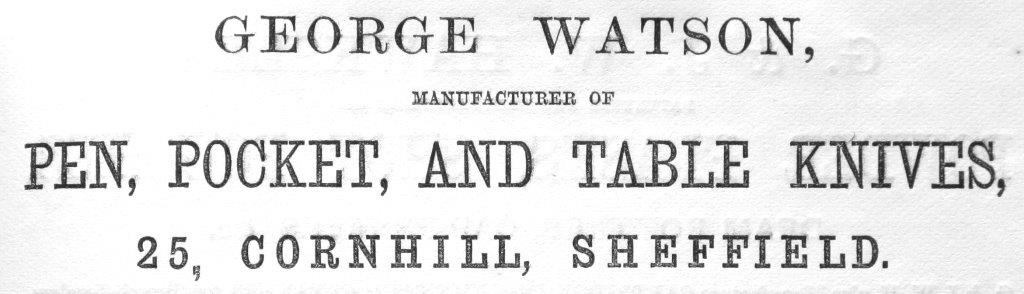 George Watson was born in Sheffield in about 1830, the son of James Watson (a table knife cutler) and his wife, Elizabeth. In 1841, the family lived in Dun Fields. In the Census (1851), George was a table knife cutler, living in Scotland Street at the home of Eliza Swindon. In the same dwelling was Eliza’s daughter, Caroline (born in France, but a British subject). Caroline was a seamstress and later became George’s wife. In 1868, George Watson advertised as a pen, pocket, and table ....