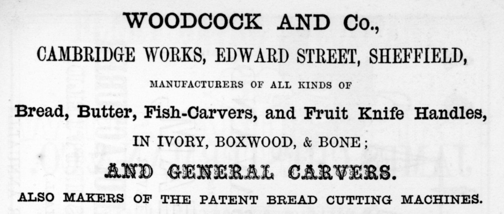 An advertisement for this firm appeared in a Sheffield directory in 1868, as a manufacturer of bread and butter knives and platters, besides patent bread-cutting machines. Carving in ivory, pearl, and boxwood was also conducted. The address was Cambridge Works, Edward Street. The owner was Thomas Woodcock (1811-1884), who was probably the son of Thomas (a presser) and Sarah. Thomas Jun. variously described himself in the Census as an ivory and pearl worker, carver, and cutlery manufacturer. His ....