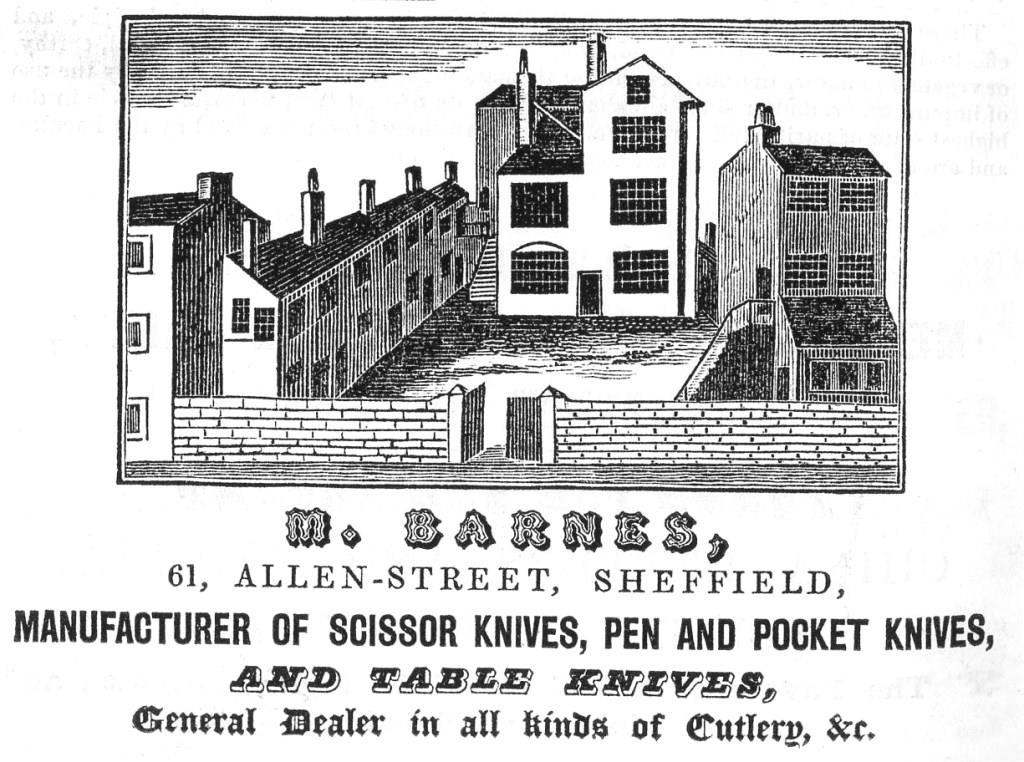 Barnes’ advertisements in Sheffield directories of 1839 and 1841 featured a quaint engraving of Barnes’ works behind a prim wall. He made scissors, pen, pocket, and table knives and was also a general dealer in cutlery. Matthew Barnes (1803-1848) was the son of George (a cutler) and Mary. The enterprise was listed at Westbar Green (1828) and Cross Smithfield (1833), when Barnes was also running a beer house. After 1837, his address was Allen Street. In the Census (1841), Barnes was l....