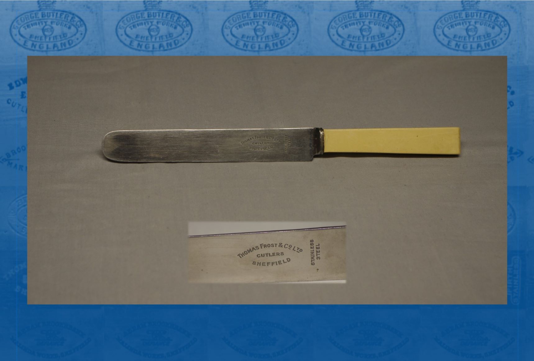 Thomas (Milner) Frost (1844-1913) was the son of John (a spring blade grinder) and his wife, Mary. The family lived at Matilda Street in the 1850s and 1860s, where Thomas began work as a pen blade grinder. In 1868, he was listed in a directory as manufacturer of flied blades and springs, Union Lane. He continued to trade at Union Works, Union Lane, into the early years of the twentieth century. He was a manufacturer of pen, pocket, and champagne knife scales, springs, blades, and shields. He liv....