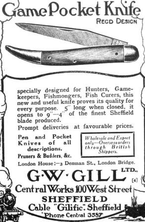 Frederick George Gill (c.1856-1929) was a spring-knife cutler, who had been born at Heeley. His wife was Isabelle (d.1926). In 1902, his working address was Backfields, but within a couple of years it was Division Street. The trading name was F. G. Gill & Sons. George William, John Henry, and Fred were the sons. During the First World War, F. G. Gill & Son was listed at 104 (back of) West Street, with George William (1889-1974) helping his father. By 1919, Frederick had moved to Bailey Lane, where he manufactur....