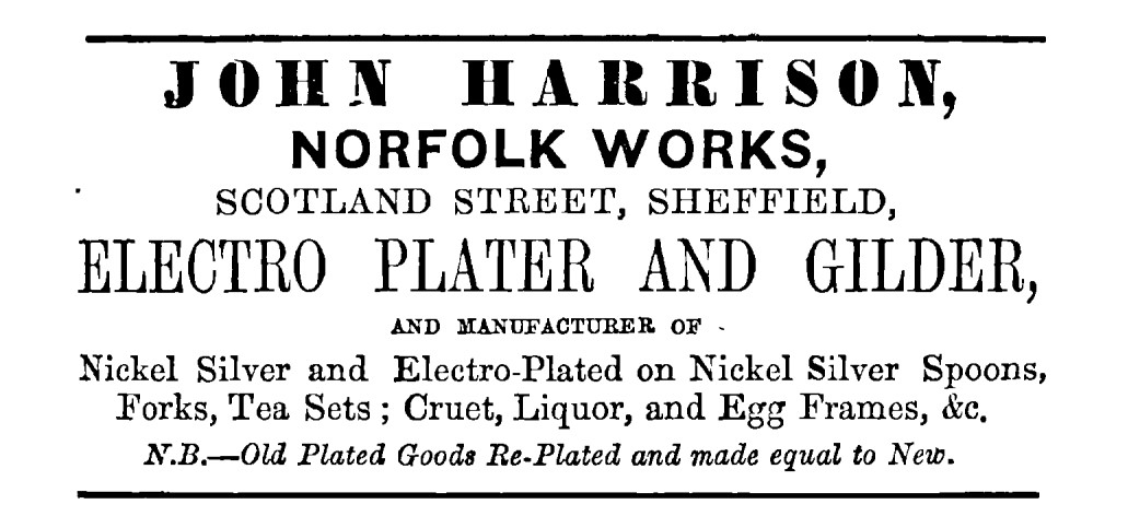 Trade reports stated that this business began in 1820. However, it was not until 1833 that John Harrison & Co was listed in a directory and registered a silver mark in Sheffield. Based in Norfolk Works, Norfolk Lane, it manufactured German silver and Britannia metal wares. The owner was John Harrison, who was born in Sheffield in about 1797, and lived in Chapel Street, Bridgehouses. In 1829, he married Miss Harriot Maleham, Arundel Cottage, Bridgehouses. By 1841, his address (both factory an....