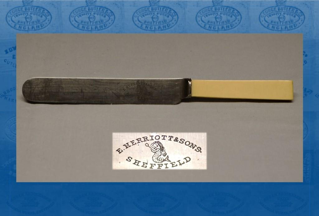 Edwin Herriott (1861-1938) was born in Norton, Derbyshire, the son of Samuel Herriott, a gardener, and his wife, Martha. By 1881, Edwin was working in Sheffield as a table cutlery warehouseman. He apparently worked as a table knife manager until 1900, when he launched E. Herriott & Sons, Backfields. He marketed farriers’, butchers’, table, pen, and pocket knives, electro-plate, and stainless cutlery. In 1905, the business was restyled F. Herriott, Son & Co (presumably a reference t....
