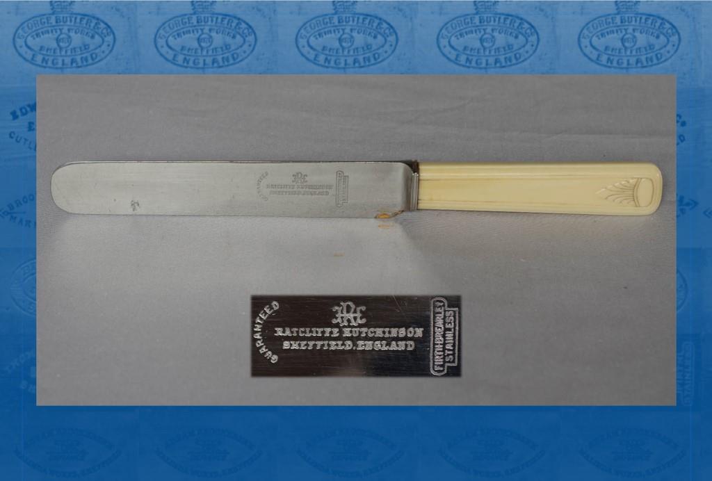 Ratcliffe Hutchinson (1887-1956) was born in Walkley, the son of John (a spring knife cutler, who later worked on his own account) and his wife, Fanny. Ratcliffe was trained as a cutler and by 1919 had acquired the Holly Street Works of Thomas Oxley. Hutchinson’s enterprise moved to Rockingham Street in the 1920s, Cavendish Street in the 1930s, and Victoria Street between the 1940s and 1967 (when it was dissolved as a limited company). Besides spoons and forks, Hutchinson marketed table knives in shea....