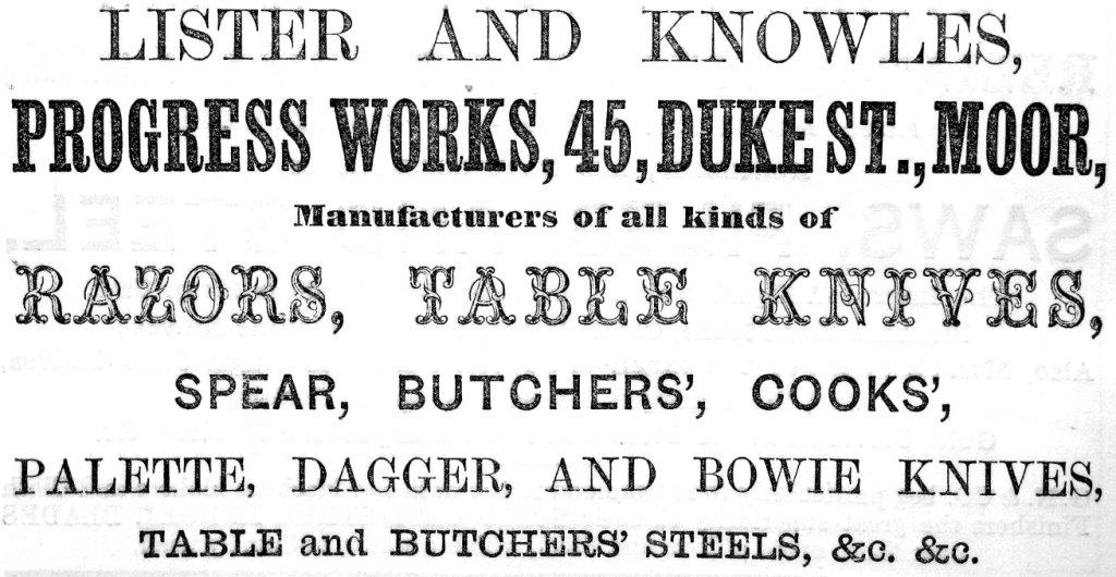 This company was apparently started in the mid-1860s. The original partnership involved John Gillott, Joel Lister, and John Knowles. Joel Lister (1840-1904) was the son of Edward Lister, a silver plater, and his wife, Ann. John Knowles (c.1820-1904) was born in Dore and was a razor smith, before becoming a cutlery manufacturer. The firm was a razor and table knife manufacturer at Progress Works in Duke Street, Moor. In 1866, Gillott withdrew. Lister in Duke Street and Knowles in Nether Edge were listed as the partners in the directory (1868), which contained an advertisement for the firm. The products were razors, table knives, spear, butchers’, cooks’, palette, dagger, and Bowie knives. The trade mark was the word ‘EQUAL’ and a rider on a horse.