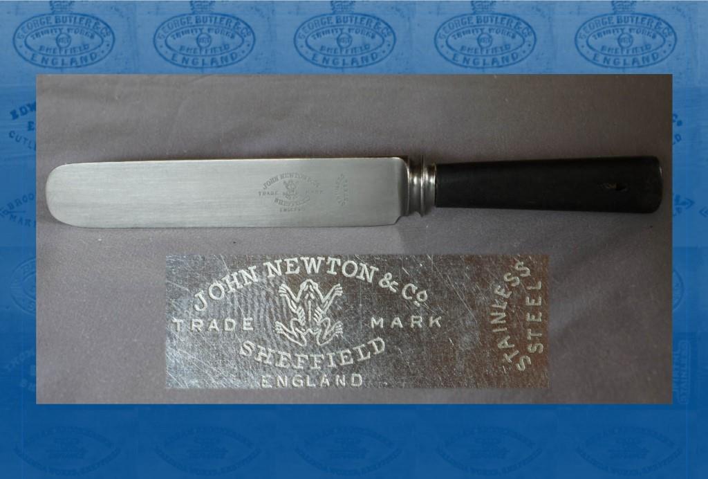 Newton sold table and pocket cutlery, Bowie knives, and razors through the New York cutlery importer H. Boker (founded by German immigrants). Meanwhile, Newton imported American goods, such as R. Heinisch’s shears, scissors, and trimmers. Industries of Sheffield (1888) claimed that Newton’s employed fifty or sixty workers. By 1900, the address of Manhattan Works was Lambert Street – the home of John Watts, which had purchased Newton’s trade marks (a picture of a frog and the words, ‘MANHATTAN CUTLERY CO, SHEFFIELD’). Newton also used the mark of Johnson, Spencer & Co, which also passed to Watts. John Newton was living in Ranmoor Cliffe Road. The firm and its owner remained listed after the First World War but disappeared from directories after 1926. John Newton, of Bents Road, died on 21 February 1937, leaving £15,586.