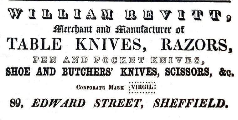 In the early nineteenth century, the Revet family moved to Netherthorpe, Sheffield. By 1825, William Revitt had opened for business in Meadow Street, making razors, pen, pocket, and table knives, and razor strops. He used the ‘VIRGIL’ mark and his razors were made of Damascus steel ‘of superior quality’. By 1833, William Revitt Jun. had joined the enterprise, living in Meadow Street, and seems to have taken over the ‘VIRGIL’ mark in 1837. The firm advertised in 1839.