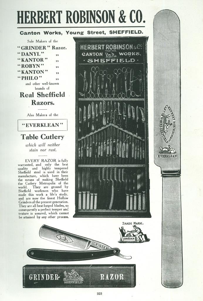 An inter-war trade advertisement showed Robinson’s products. ‘EVERKLEAN’ table cutlery was given prominence, alongside traditional hollow-ground razors, with a range of marks: ‘GRINDER’, ‘DANYL’, ‘KANTOR’, ‘ROBYN’, ‘KANTON’, ‘PHILO’. The grinder (picture) mark had been owned by Green & Green Ltd. The company also produced a traditional variety of pocket cutlery. Herbert Robinson, Rushley Road, Dore, died on 22 December 1935. He was buried at Christ Church, Dore. He left £9,232 to his widow, Gertrude Deniff Robinson. After the Second World War, the firm was styled Herbert Robinson & Co (Cutlers) Ltd at Canton Works, Rockingham Lane. It was bankrupt in 1968.