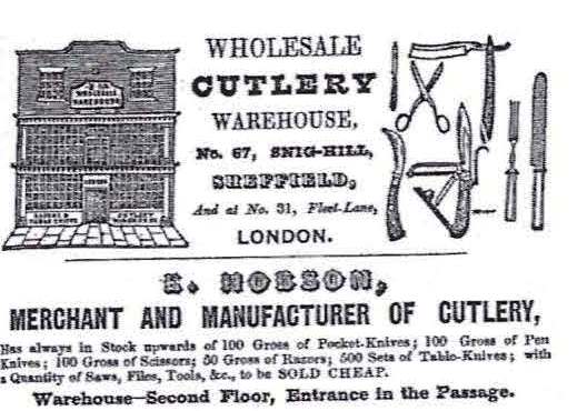Edward Hobson (1799-1858) was the son of razor smith (and later farmer) Joseph Walshaw Hobson (d.1843, aged 80), of Stannington Wood. By 1825, Edward was a razor manufacturer and hardware dealer at Snig Hill. He once paid damages to Joseph Rodgers & Sons for imitating its name (Sheffield Independent, 13 December 1834). In 1839, Hobson advertised his ‘wholesale cutlery warehouse’, where he ‘always has several hundred gross of pen, pocket and Wharncliffe knives in stock, with a large assortment of scissors, razors, table knives, saws, files, etc., suitable for the American or Country Trade, and to be sold cheap!!’ An advertisement in 1841 made the ‘warehouse’ seem less grand: it was on the ‘second floor, entrance in the passage’. Nevertheless, Hobson had a London address in Fleet Lane and in 1841 was granted a Freedom of the City of London as a cutler. He sold Bowies (Littman, 20081). Edward’s sons, by his wife Hannah (d. 1856) – Henry and John Barber – became cutlery dealers.