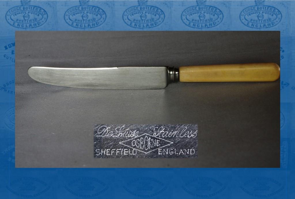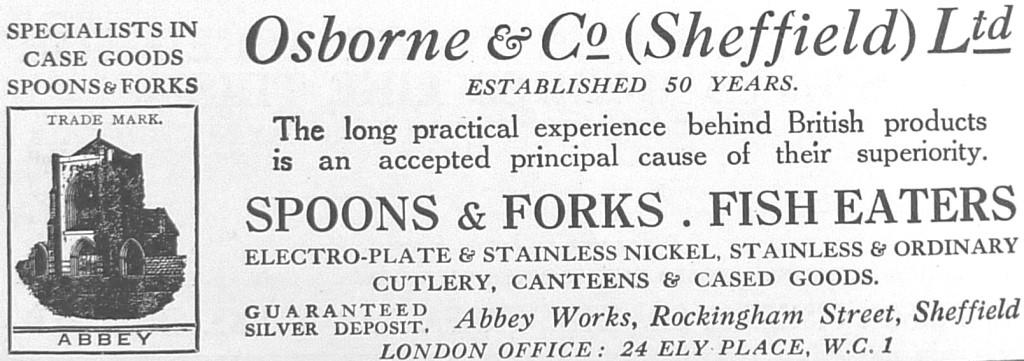 After Gilpin’s death, his sons – David Gilpin (1869-1953) and Tom Gilpin (1881-1967) – took over Osborne & Co. In 1919, it was listed at Abbey Works, Rockingham Street. The ‘ABBEY’ trade mark (registered in 1913) depicted Beauchief Abbey. In 1926, Osborne & Co (Sheffield) Ltd was formed, with £15,000 authorised capital (of which £1,200 was issued in ordinary shares). The firm traded in Rockingham Street until about 1939, when Tom Gilpin started his own business. Osborne & Co (Sheffield) Ltd apparently became part of Sipelia Group, but was liquidated in 1970.