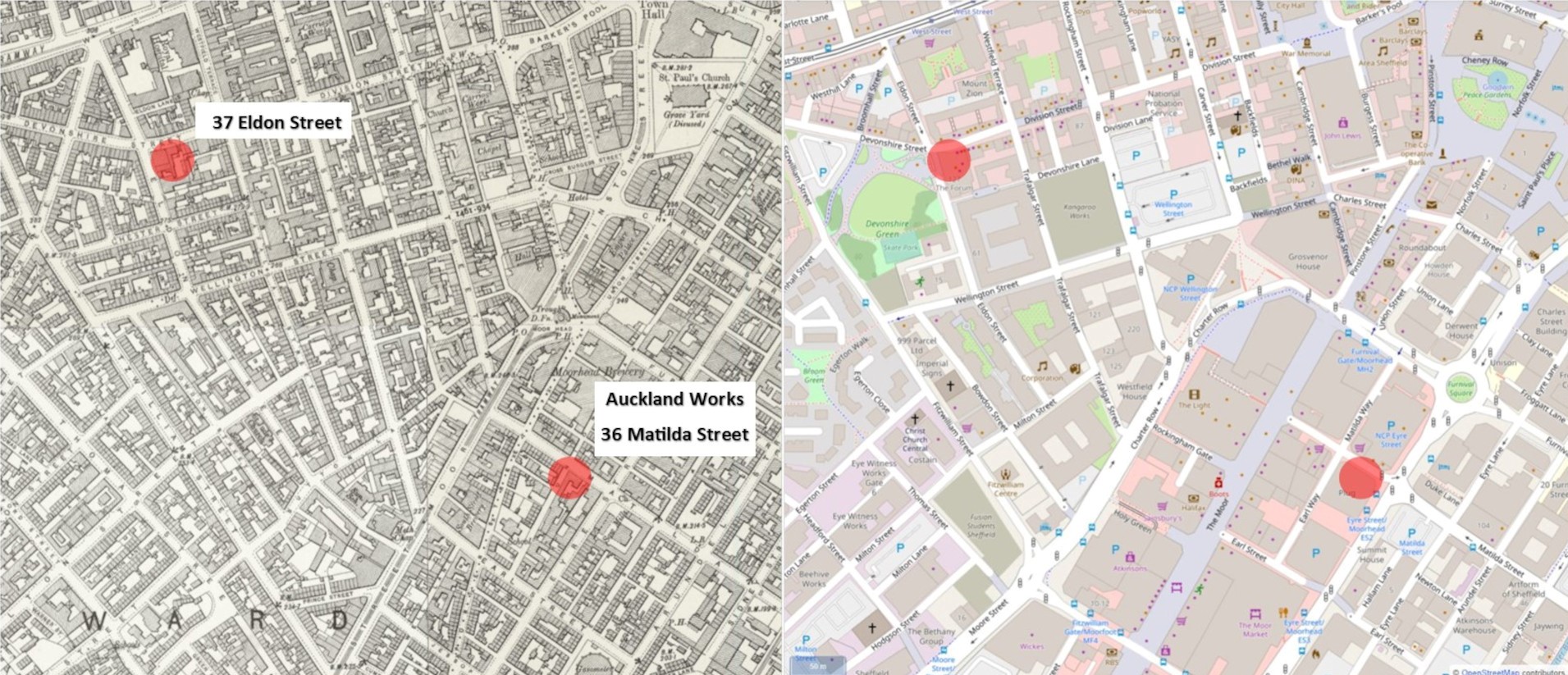 John Thomas followed in the trade as a silver buffer. In 1885, he married Emily née Thompson. Their daughter, Elsie, married Frank Ayres at Sharrow in 1914. Ayres, the son of the late H. E. Ayres of Egypt, had been born at Norwich in 1886 (Sheffield Daily Independent, 11 February 1914). He was a motor car driver. After the War, Stokes was a silver finisher at Eldon Street. In 1922, Stokes, Ayres & Co appeared in a directory as a silver finisher at the same address. John T. Stokes and Frank Ayres were the partners. By 1924, the address was 36 Matilda Street. A report of a fire in the buffing shop gave a precise location: the third floor of Auckland Works, at the corner of Union Lane and Matilda Street, in premises which contained 114 tenement workshops (Sheffield Daily Telegraph, 21 December 1925).
