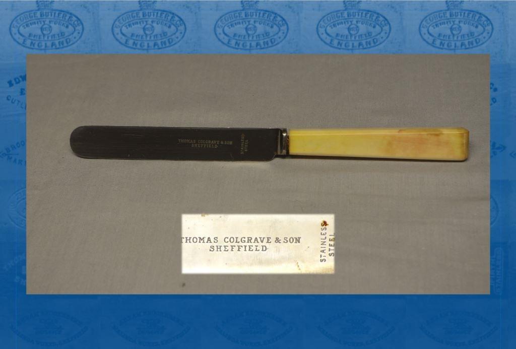 For several generations, the Colgrave family – originally spelled as Colgreaves or Colgraves – had been involved in hand-forging table knife blades at Ecclesall. Thomas Colgrave (c.1781-1867) worked at Lane End and married Sarah nee Lingard. One branch of the family was listed in directories at Dobbin Hill and Button Hill. This Hawley stainless knife was apparently linked to another offshoot of the Colgrave-Lingard family, which later moved to Sheffield.