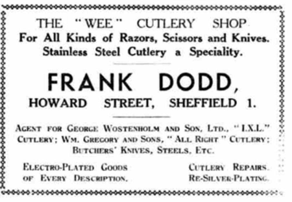 At some time during the following four years Frank's career changed direction again and he became the owner of The Wee Cutlery Shop in Howard Street, at the junction with Arundel Street. The 1911 census records both his and Mary's occupations as 'cutlery & electroplate dealer on own account'. An article in the 1933 Sheffield Independent newspaper describes the shop as 'a Sheffield institution, the proprietor supplies just about everything that can be be got in the cutlery line, and he has special knowledge of the cutlery and electro-plate trade of Sheffield'. An advertisement included with the article lists the supply of 'all kinds of razors, scissors and knives. Stainless steel cutlery a speciality', he was also an agent for several Sheffield cutlery manufacturers. (What would now be described as a 'one stop shop for all things cutlery'). Frank also had 'the odd run-in with the Law'; being fined £1 plus costs for remaining open at 1.25pm on early closing day in 1914!