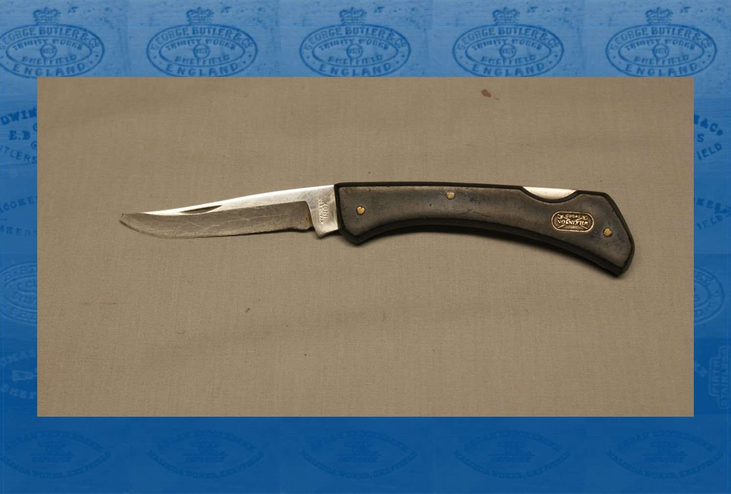 In 1905, Wilkinson Sword decided to establish its own operation in Sheffield (Shadbolt, 20122). It acquired James Pinder & Co, which had recently been liquidated. Wilkinson occupied Pinder’s old premises at Nos. 14 & 16 Arundel Lane and was listed in directories as a manufacturer of silver and electro-plate goods, table cutlery, and razors. Wilkinson also acquired Pinder’s mark – a centrepiece – with ‘WILKINSON’ used instead of ‘P’. The Sheffield premises were named Colonial Works, which Wilkinson drew upon for a variety of knives. Folding Bowie knives (such as the ‘Wilkinson Explorer Knife’) and sportsman’s knives were among those products. The venture appears to have been unsuccessful and Wilkinson disposed of Colonial Works in about 1908. Shadbolt believes that a large stock had accumulated, which continued to be offered in trade catalogues into the early 1920s. Some of this cutlery was marked ‘WILKINSON LONDON & SHEFFIELD’.
