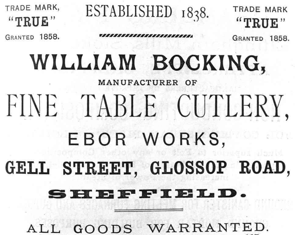 By 1879, George’s son, William (1857-1946), had re-established the business as William Bocking (‘late Geo. Bocking’), Ebor Works, 53 Gell Street. The factory was described as ‘large and spacious’ in The Century’s Progress (1893), but was a modest building, employing apparently no more than thirty or so workers. It marketed fine table knives, pocket knives, and ‘every description of silver cutlery’. Table cutlery was a speciality and Bocking guaranteed it as hand-made from double-shear steel. The trade mark, ‘TRUE’, was bought for £10 from Horrabin in 1885; and a silver mark was registered in Sheffield in 1898.