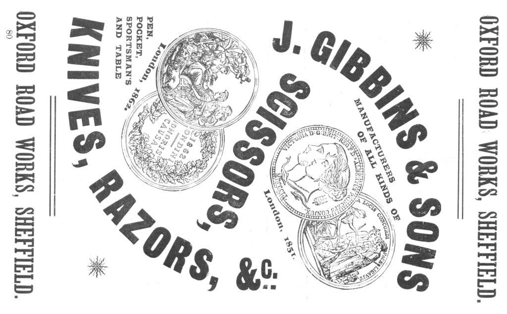 The firm won exhibition medals in Paris (1855) and London (1862). The Gibbins’ were still in Cricket Inn Road at the start of the 1860s, with Joseph Jun. and his wife Mary living with their daughters Misses Eliza and Harriet (who operated a ladies’ seminary). Pawson & Brailsford’s Illustrated Guide (1862) had an advertisement for J. Gibbins & Sons, showing that it had moved to Headford Street and besides scissors, the firm sold pocket, and sportsman’s knives. It was operated by Joseph, Henry, John, and Samuel Gibbins. In 1861, Joseph Gibbins, the founder, told the Census that he employed 20 men and six women. He died on 20 April 1863 in Cricket Inn Road, aged 75, and was buried in the General Cemetery (which was to become the burial location for all Joseph’s sons).