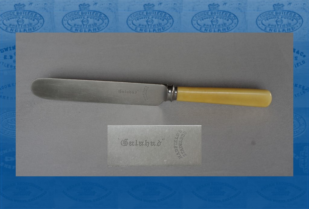 Hadfields Ltd was one of Sheffield’s leading steel and armaments firms, which was based at East Hecla Works at Tinsley (the present location of Meadowhall Shopping Centre). The company was particularly noted for its alloy steels, which had been developed by its famous chairman Sir Robert Hadfield (1858-1940). Hadfields had several trade marks, including ‘GALAHAD’, which was used on cutlery and edge tools. However. the company was not a cutlery manufacturer (though it was a stainless steel producer). Like a few other Sheffield steel firms, it evidently sometimes marketed its own cutlery (bought in from local makers). ‘GALAHAD’ table knives were presumably made as an advertisement or loss-leader to ensure that Hadfields’ name was in the public eye. Pocket knives have also survived, marked ‘HADFIELDS PATENT STEEL’, which was doubtless a reference to Sir Robert’s famous discovery of manganese steel. An Australian visitor, who met him in the mid-1920s, observed that: ‘His first act was usually to give any stranger who turned up [at his office] a valuable penknife’ (The Bulletin, Sydney, 16 October 1940).