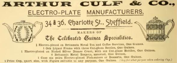 Arthur Culf (c.1819-1892) was born in Birmingham, but later moved to Sheffield and by 1841 was a metal smith living in Portobello Street, with his wife Elizabeth and family. In 1872, he apparently launched his business, which was based in Charlotte Street and made Britannia metal and electro-plate goods. Arthur was in partnership with his son, Carrington Culf (1857-1919), but in 1888 this was dissolved. William Henry Allcard took over and the firm became ‘& Co’. In 1891, a silver mark ‘W.H.A.’ was registered by Arthur Culf & Co, Rock Works, Charlotte Street. The firm soon became Allcard & Co. Arthur Culf, Salmon Street, Sharrow Lane, died on 22 April 1892, leaving £233. A Methodist, he had been involved in the Temperance Movement. By 1901, Carrington was a road labourer. The Culf trade mark was ‘BLUE RIBBON ARMY’.